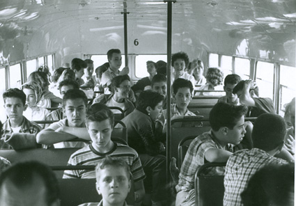 196?Grupo de alumnos de bachillerato ene l camión escolar.