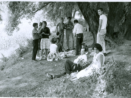 196?Grupo mixto de jóvenes sentados bajo un árbol, comiendo. Algunos otros se encuentran de pié alrededor de un mantel, en una práctica de campo.