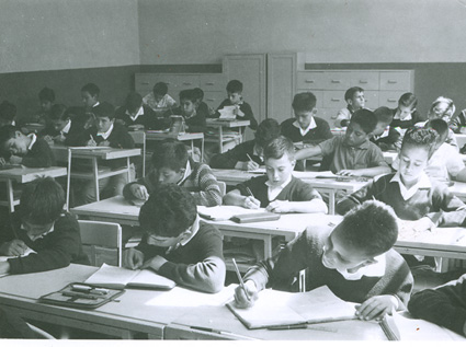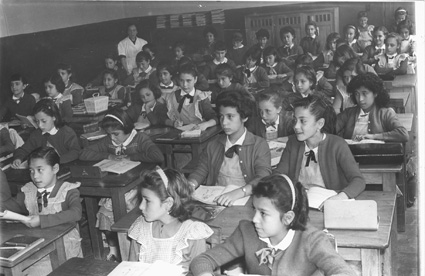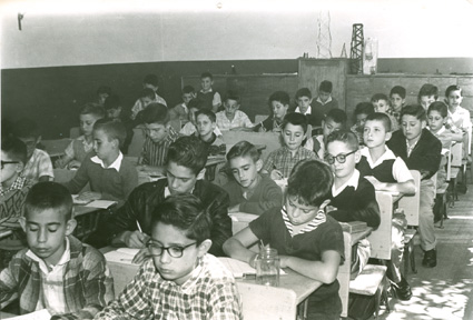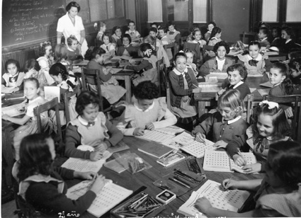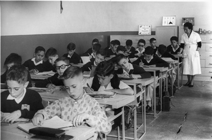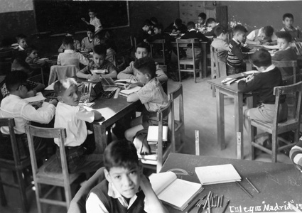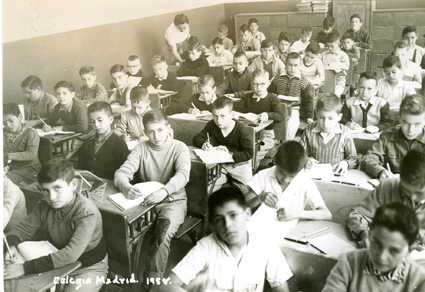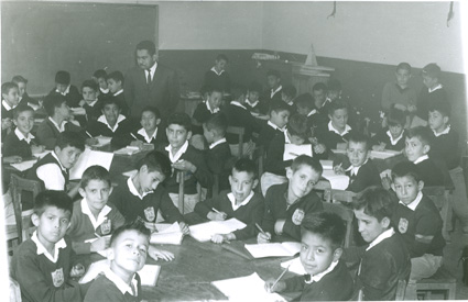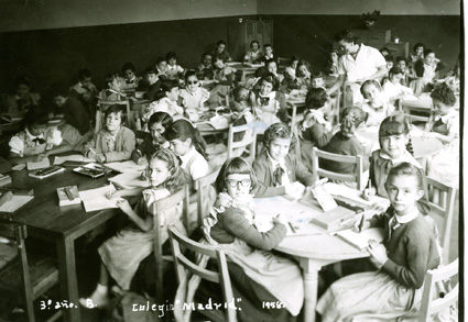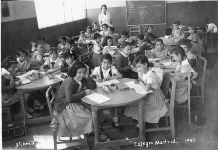 1958Grupo de alumnos del quinto grado de primaria sentados en sus pupitres. Al fondo se ve la maestra revisando el trabajo de un niño.