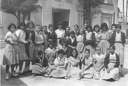 1956Grupo mixto de alumnos del primer grado de primaria, sentados en las escaleras exteriores del edifico. La maestra está sentada al centro de las escaleras.