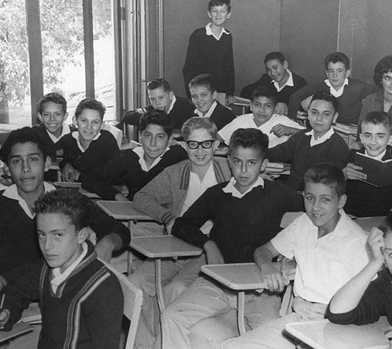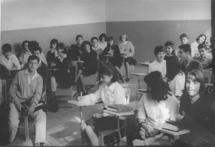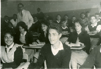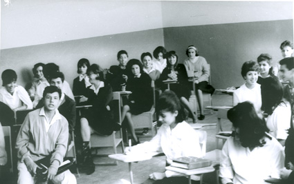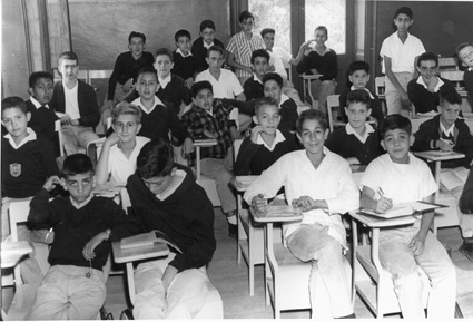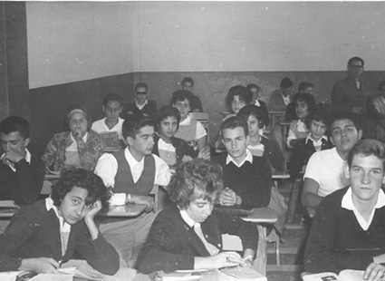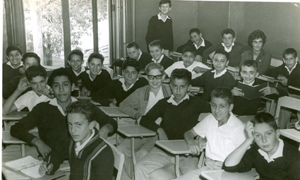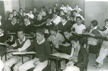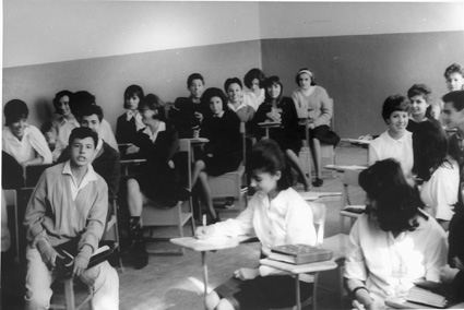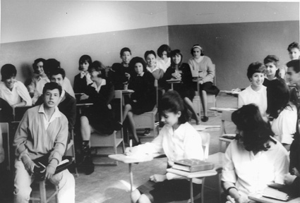 1961Grupo mixto de alumnos del primer grado de secundaria, sentados en sus pupitres. Al fondo está el profesor Marcial Rodríguez.