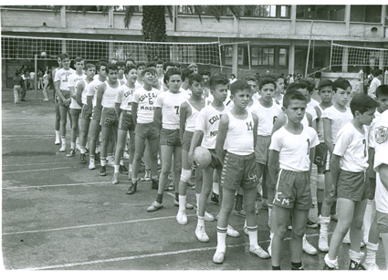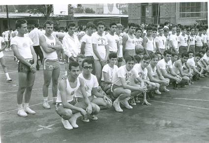 1964Alumnos vestidos en uniforme deportivo, Se encuentran en la cancha, la red se ve detrás, se encuentran de pie en dos filas en diagonal hacia el fondo del patio.