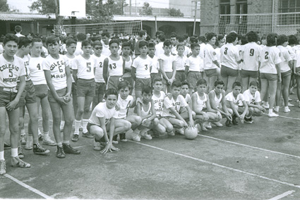 1964Alumnos vestidos en uniforme deportivo, Se encuentran en la cancha, la red se ve detrás, se encuentran de pie en dos filas en diagonal hacia el fondo del patio.En n costado se ve otro grupo de espaldas a la camara.