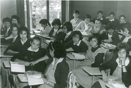 1961Grupo de alumnas del primer grado de secundaria, sentadas en sus pupitres.