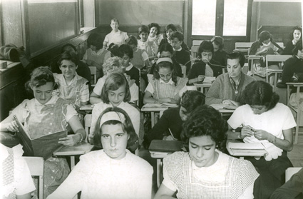 1961Grupo de jóvenes mujeres sentadas en sus pupitres. La maestra esta al fondo del salón, de pie junto a la ventana.