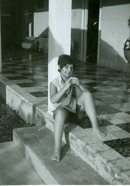 196?Hotel Yucalpetén, Yucatan, mujer recargada en una columna, sentada en el suelo.