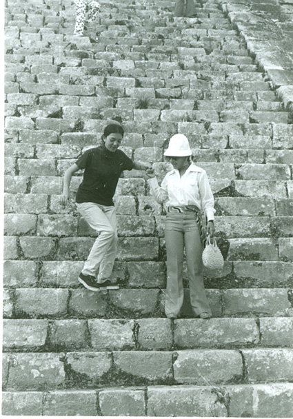 196?Estudiantes y maestra sentados en las escaleras de un sitio arqueológico. Dra Dolores Revaque.
