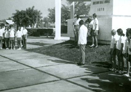 1964Alumnos vestidos en uniforme deportivo, Se encuentran en la cancha, la red se ve detrás, se encuentran de pie en dos filas hacia el fondo del patio. Sostienen el banderín del colegio.