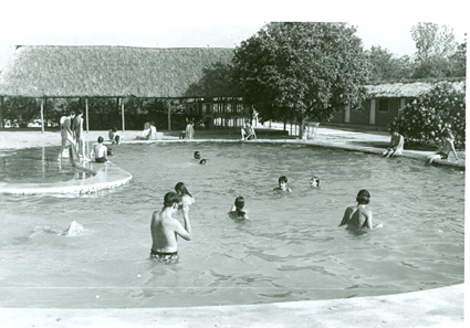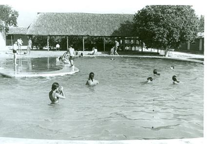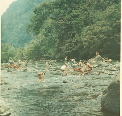 1967Grupo de jóvenes nadando en el rio. Se ven arboles atrás.