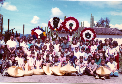196?Foto de grupo de alumnos en una práctica de campo. Se ven cactaceas atrás, una casa con techo de tejas, en el grupo hay 4 indígenas con trajes tradicionales, algunos alumnos llevan enormes sombreros tejidos de palma.