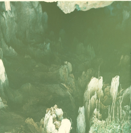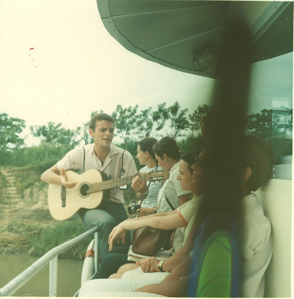 1967Paisaje, orilla de un río (?) se ven palmeras. El borde del acantilado, varios alumnos en una embarcación, uno de ellos, Romualdo, toca la guitarra y canta.