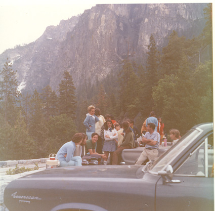 196?Grupo de alumnos y MAESTROS en una parada de la carretera, se ve un auto american, algunos están sentados y otros de pie, al fondo se ve la montaña y parte del bosque.