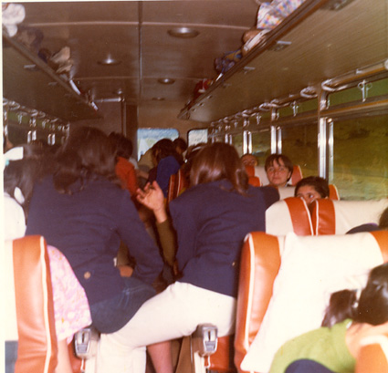 1967Grupo de jóvenes en el autobús de espaldas a la cámara.