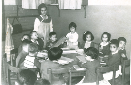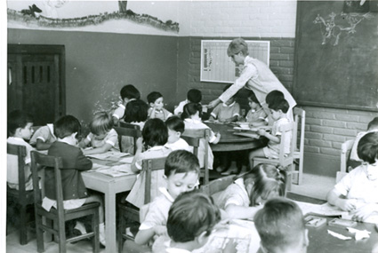 1958Alumnas del grupo de segundo de primaria, grupo B; sentadas en mesas distribuidas alrededor del salón, al fondo se ve la maestra revisando el trabajo.