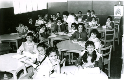 195?Alumnos del grupo de primaria, ; sentados en sus pupitres. Al fondo esta la maestra revisando el trabajo de un alumno.