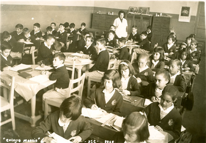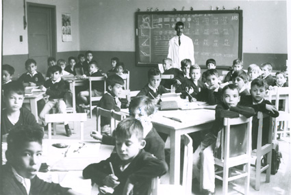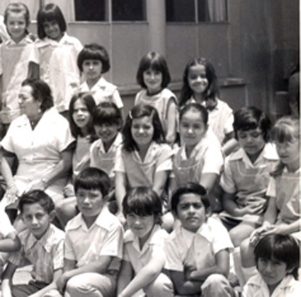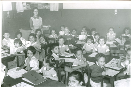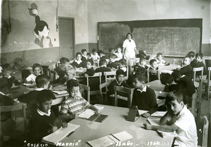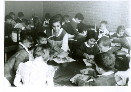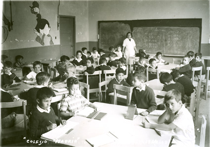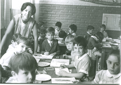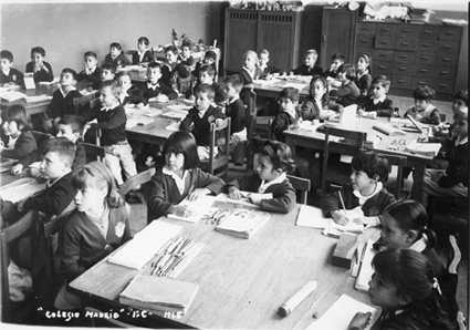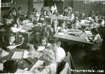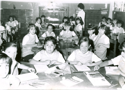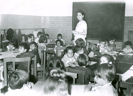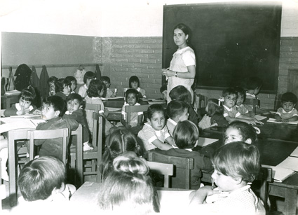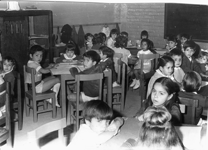 1965Grupo mixto de niños de primero de primaria, sentados en mesas. La maestra esta al fondo del salón junto al pizarrón.