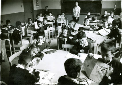 1965Grupo de mixto de primaria, sentados en sus mesas dibujando. La maestra esta al fondo del salón.