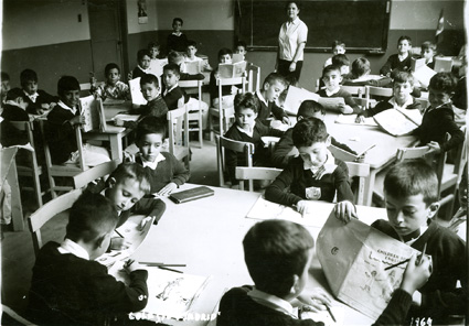 1965Grupo mixto de niños de primero de primaria, sentados en mesas.