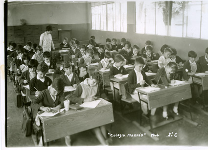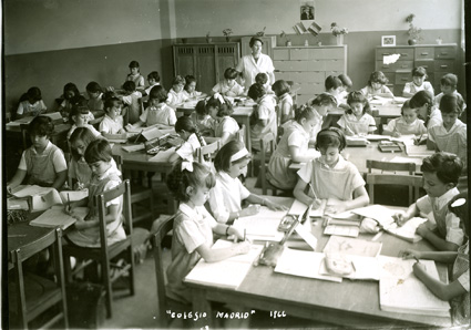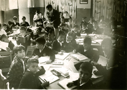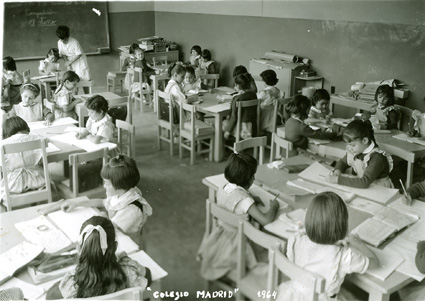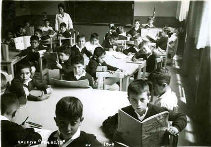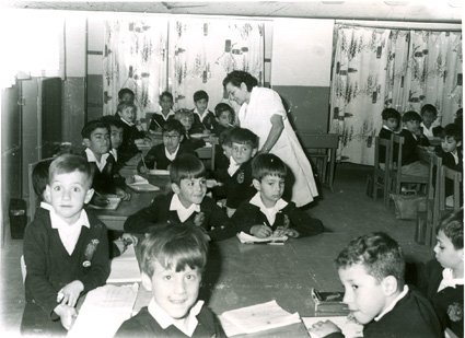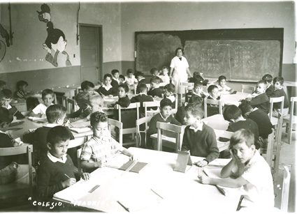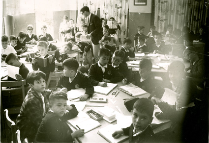 1964Grupo de mixto de primaria, sentados en sus mesas dibujando. La maestra esta al fondo del salón.