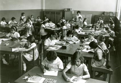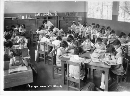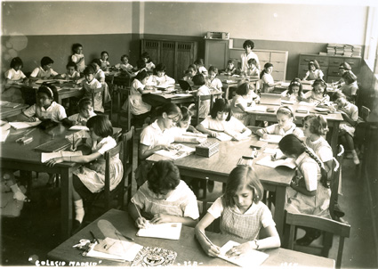 196?Grupo de niñas de primaria, sentadas en mesas trabajando. En la pared se ven los suéteres colgados del perchero.