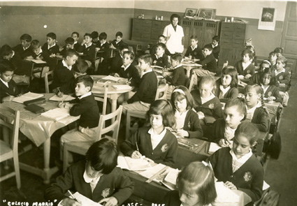 1966Grupo de mixto de primaria, sentados en sus mesas dibujando. La maestra esta al fondo del salón.