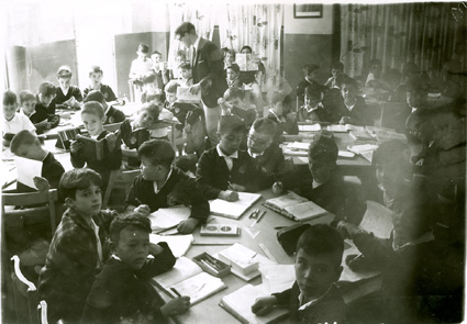 1966Grupo mixto de niños de segundo de primaria, sentados en sus pupitres en tres filas . La maestra esta al fondo del salón revisando el trabajo de un niño.