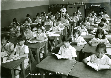 1966Grupo de niñas del cuarto grado de primaria, sentadaos en sus mesas leyendo. La maestra esta al fondo del salón.