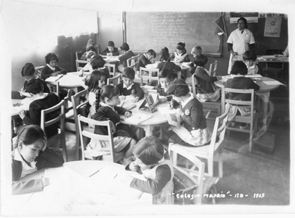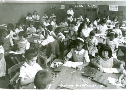 196?Grupo de niñas de primaria, sentadas en mesas dibujando. En la pared se ven los suéteres colgados del perchero La maestra revisa un trabajo al fondo del salón.