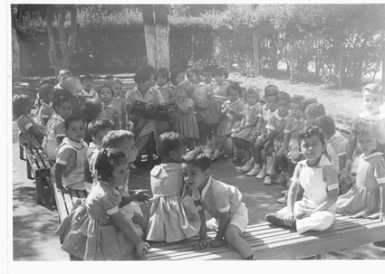 196?Grupo mixto de niños de prescolar, sentados en banquitas alrededor de su maestra, en el jardín del colegio. La maestra les esta leyendo y tiene un libro en las manos.