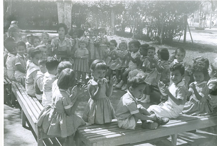 197?Fotografía de grupo mixto de alumnos de prescolar o primaria baja en el jardín escolar. La maestra esta presente.