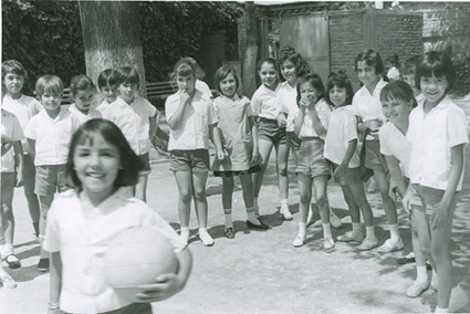 1968Grupo de niñas de primaria, en uniforme deportivo. En primer plano una pequeña está sosteniendo una pelota. Ligeramente movida.