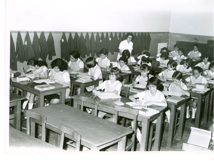 1966Grupo de niñas de segundo de primaria, sentadas en sus mesas en tres filas . La maestra esta al fondo del salón revisando el trabajo de una niña.