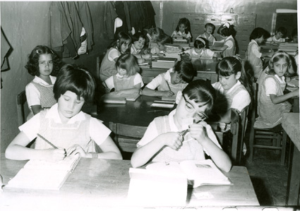 1971Grupo de niñas de primaria sentadas en sus mesas trabajandfo. La maestra esta de espaldas a la cámara.