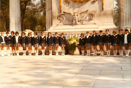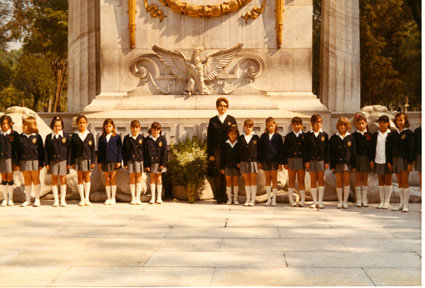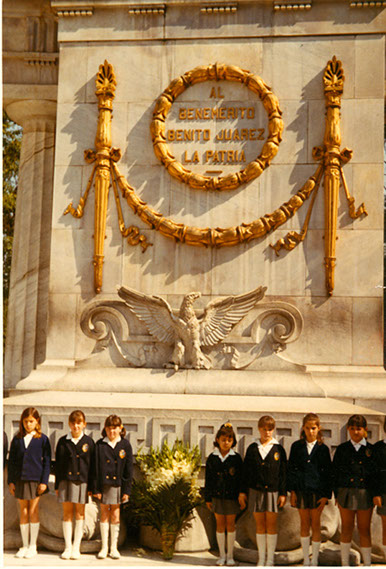 1971Grupo de niñas en la ceremonia cívica en el monumento a Benito Juárez. Están de pie frente al monumento.