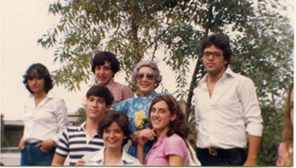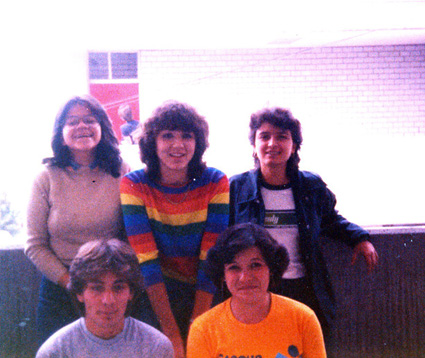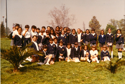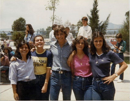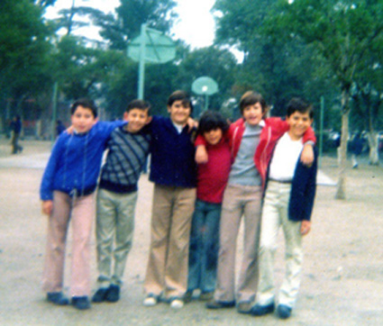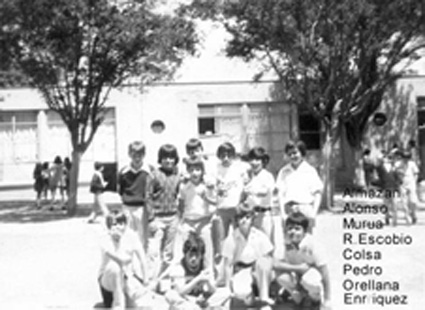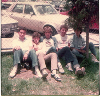 198?Foto de grupo de 5 alumnos en el estacionamiento del Colegio.