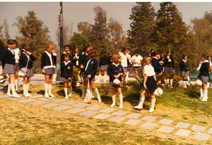 1971Grupo de niñas después de la ceremonia cívica en el monumento a Benito Juárez. Están caminando en un jardin.
