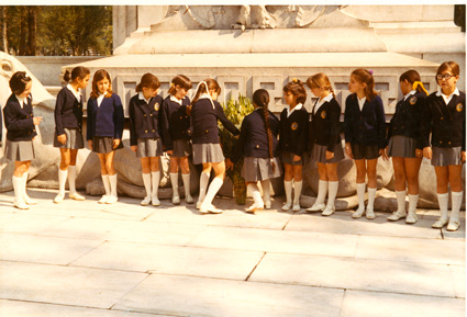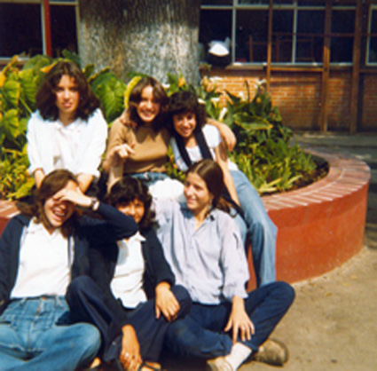 198?Alumnnas sentadas en la jardinera del colegio. al fondo se ve parte del edificio.