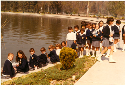 198?Alumnnos sentados contra la malla ciclónica del estacionamiento del colegio.