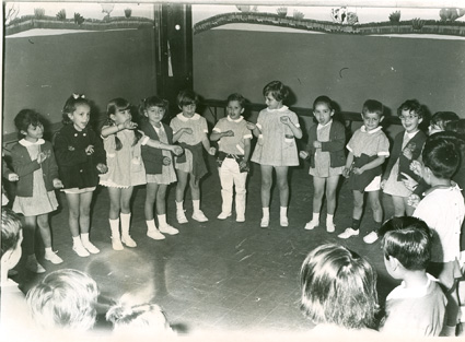 197?Grupo mixto de preescolar bailando y cantando en círculo .