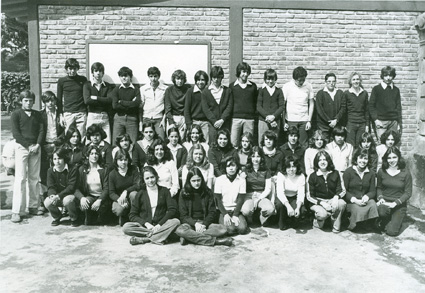 197?Foto de grupo de alumnos de bachillerato(?) contra la pared del edificio del Colegio.