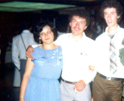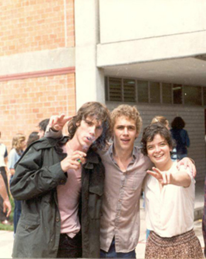 198?Tres alumnos abrazados en el patio del bachillerato. Uno de ellos esta fumando.