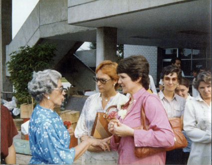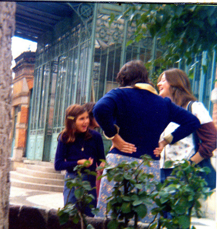 198?Grupo de alumnas platicando afuera del edificio de MIXCOAC. Estan de espaldas a la cámara. Se ve una jardinera en primer plano. Ligeramente movida.