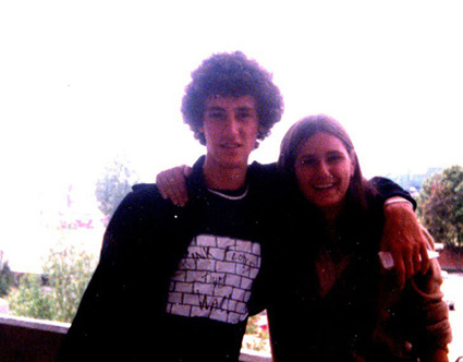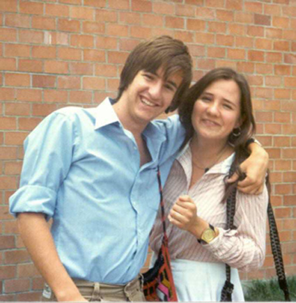 198?Pareja de alumnos abrazados fuera del edificio del Colegio.