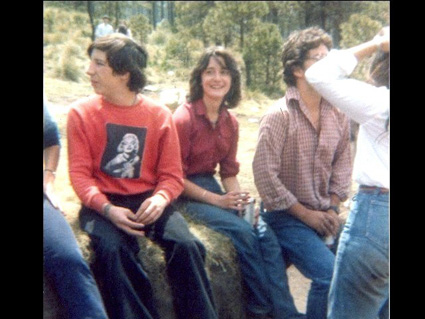 198?Alumnos sentados en una piedra, al fondo se ve el bosque.