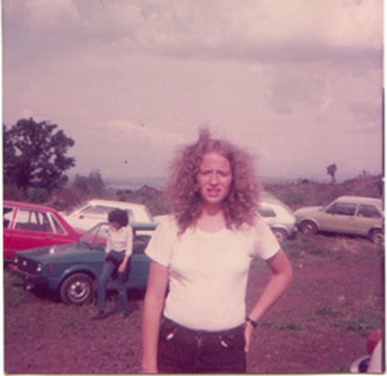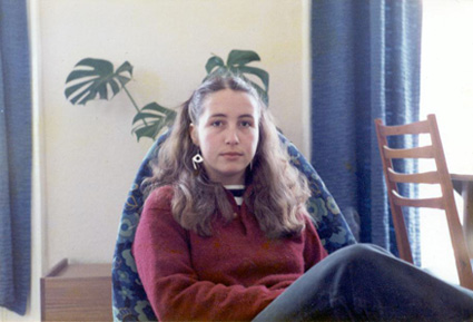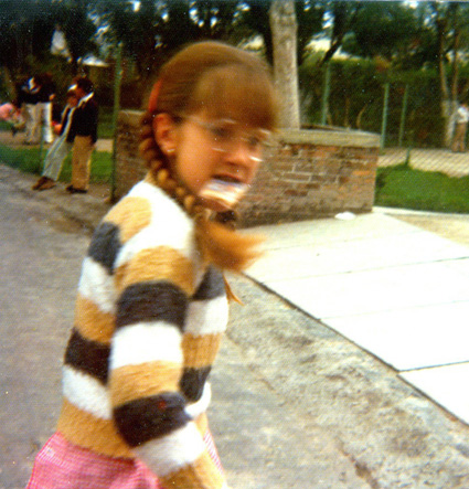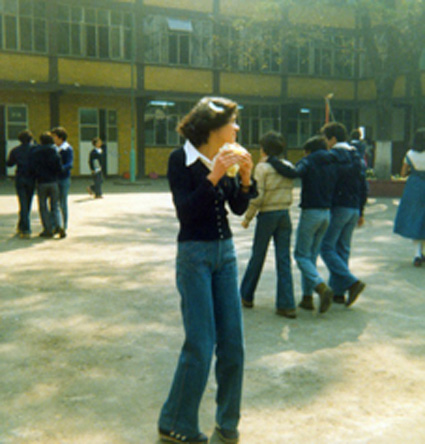 197?Alumna con trenzas, lentes y sueter a rayas lleva algo en la boca. Al fondo se ve la jardinera y la reja. Ligeramente movida.