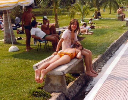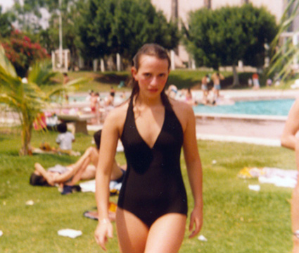 198?Alumna en traje de baño camina hacia la cámara. Al fondo se ve la alberca varias personas tomando el sol. Estan en un jardín que parece ser del Centro Asturiano de México.