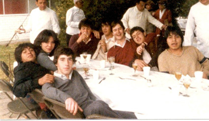 198?Jóvenes sentados en una mesa, después de una comida. Al fondo se ven los meseros y el edifico escolar.