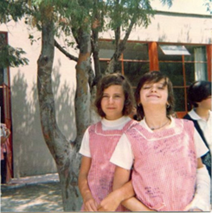 197?Dos alumnas de primaria alta o secundaria en el patio del colegio. Llevan los brazos entrelazados.