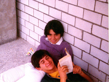 198?Alumna sentada contra la pared del edificio del colegio. Un joven se encuentra acostado y recargado en el regazo de ella. El esta leyendo un libro.