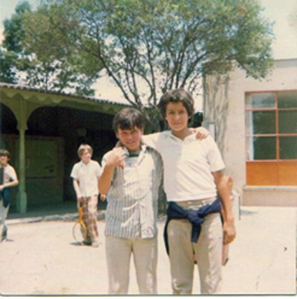 198?Dos niños abrazados en el patio del colegio. Ven a la cámara.